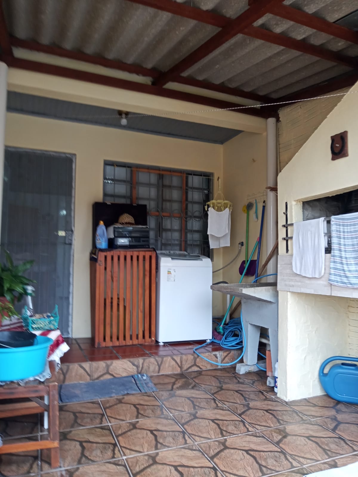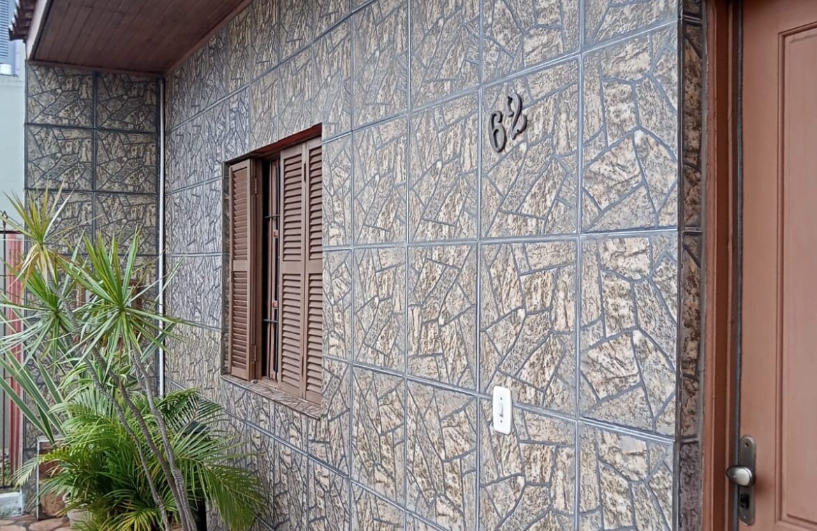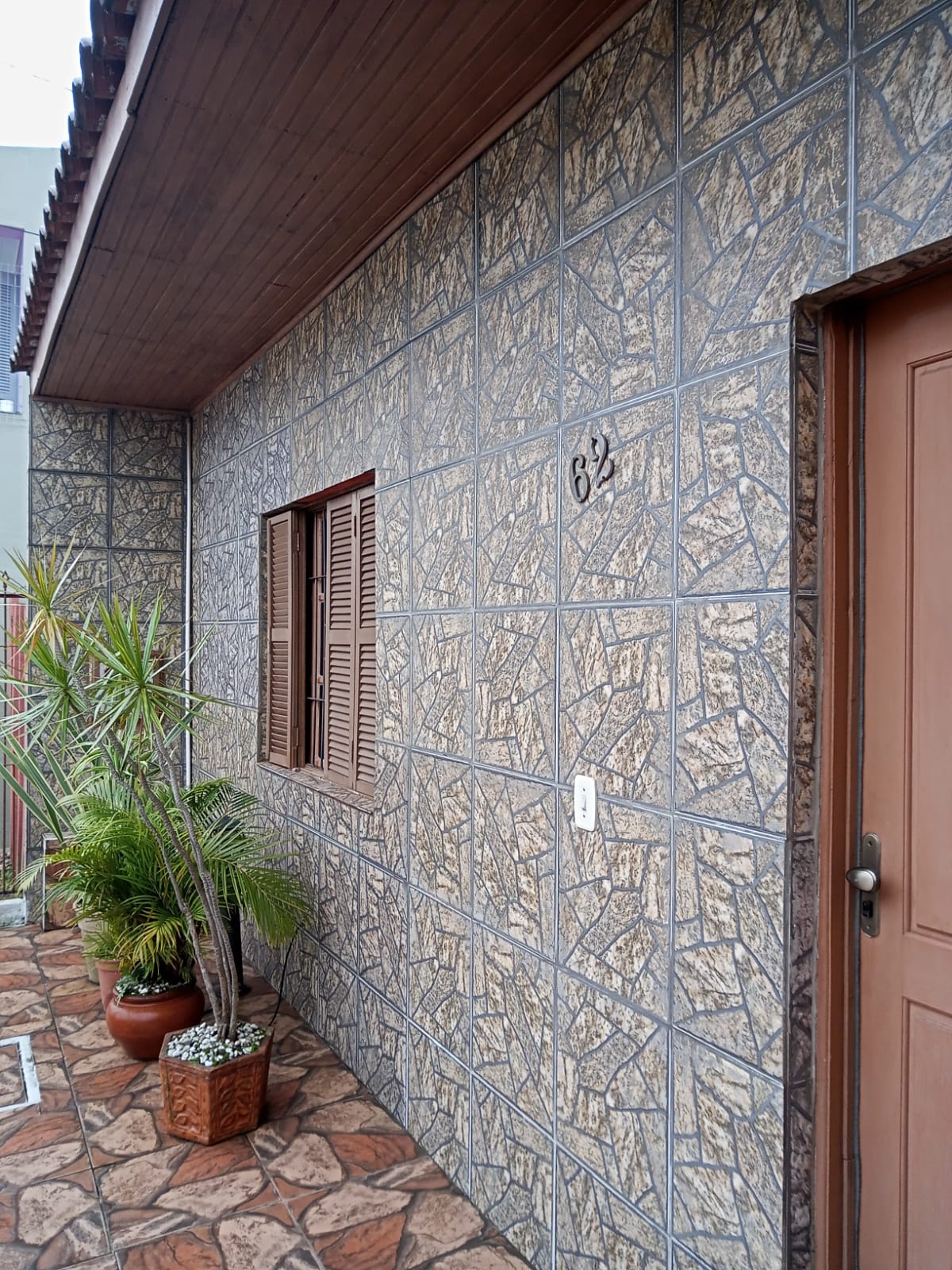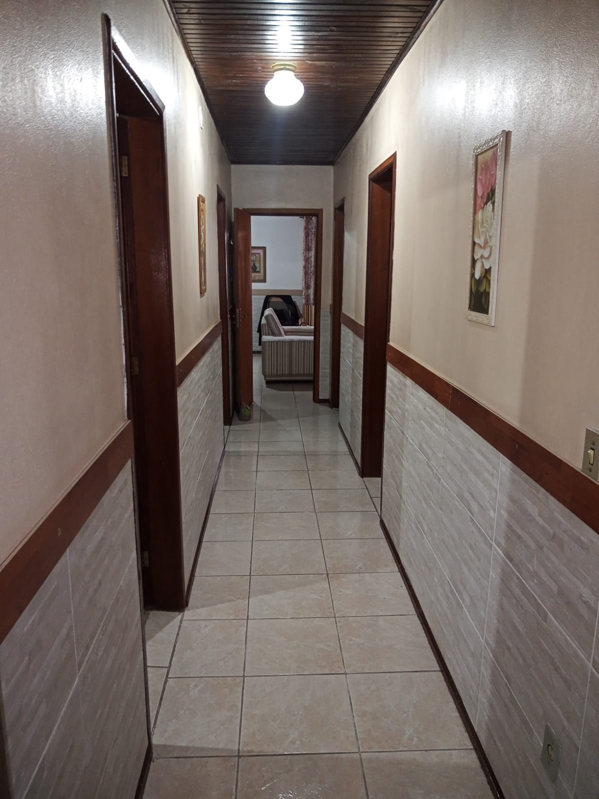 Casa de alvenaria, hall de entrada, sala ampla estar e jantar, circulação, 3 dormitórios, banheiro, copa, cozinha e área de serviço.