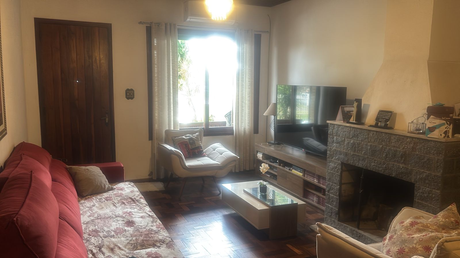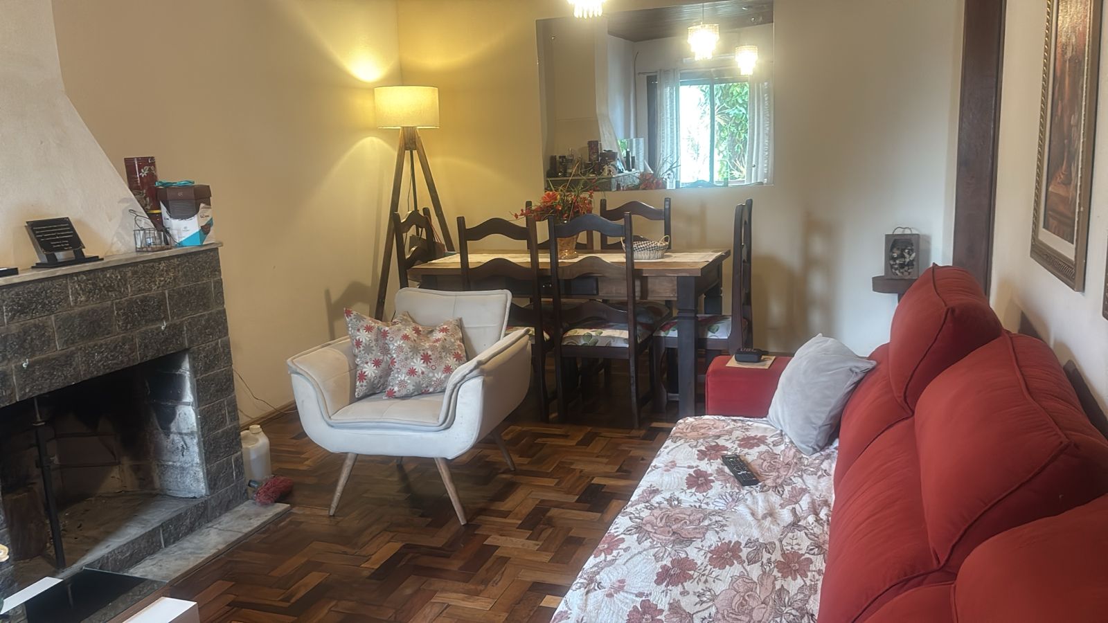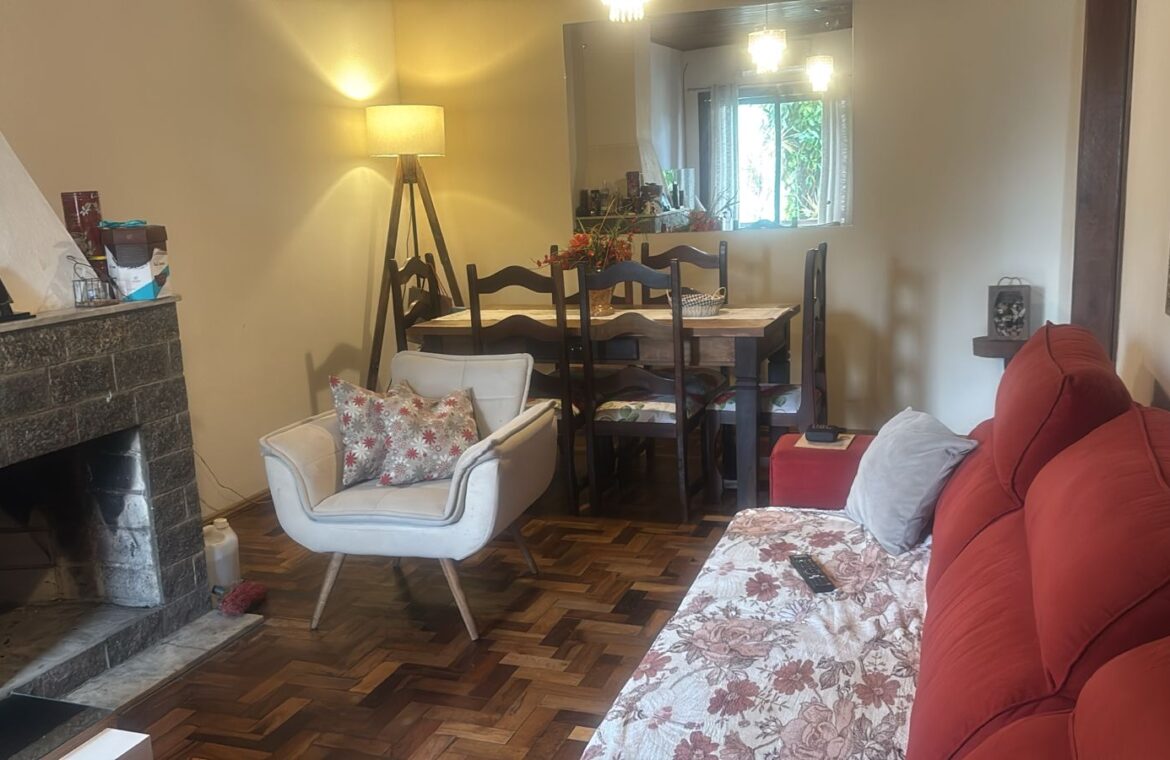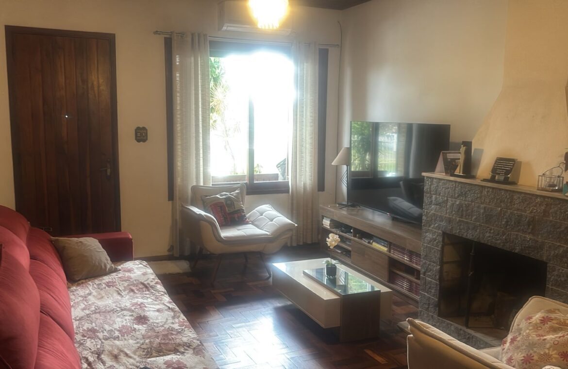Sala ampla de estar e jantar com lareira,  circulação, 5 dormitórios, sendo 1 suíte, banheiros, cozinha e área de serviço.