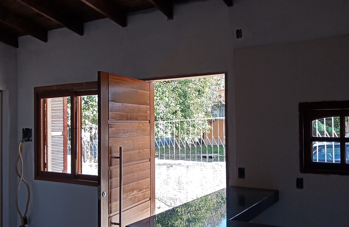 Casa de esquina em alvenaria, totalmente reformada, pé direito alto, aberturas em madeira, piso porcelanato, apresenta sala com lareira e cozinha integradas, 2 dormitórios, banheiro, área de serviço, pátio e entrada para carro.